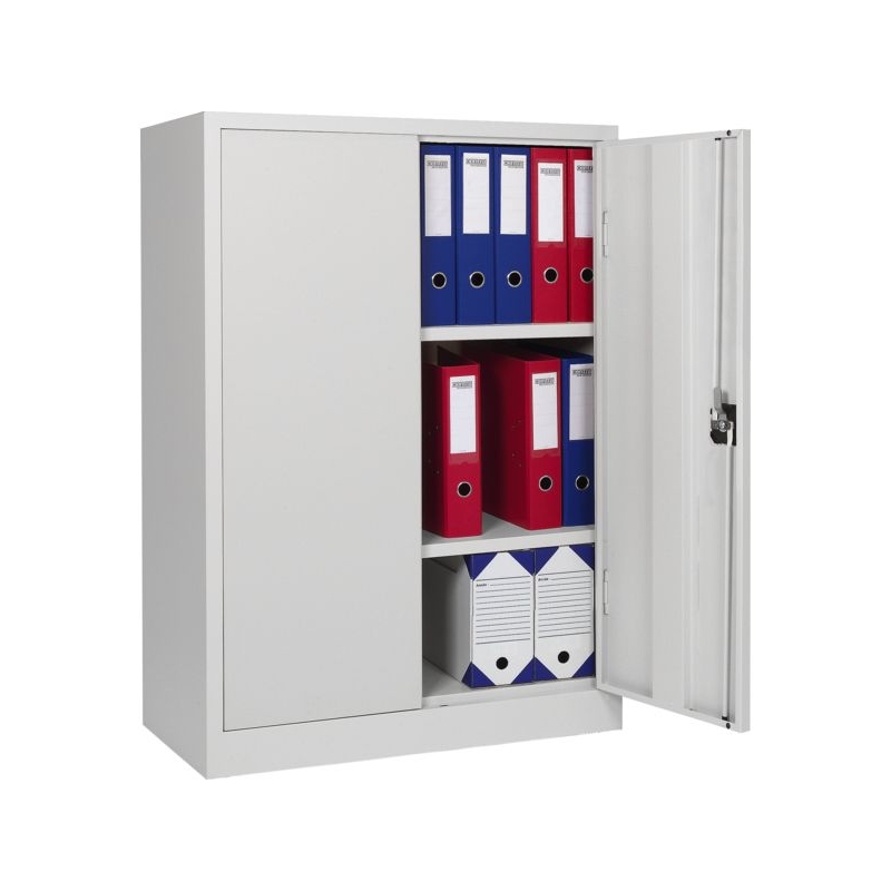Armoire monobloc grise, à portes battantes. Armoire haute équipée de 4 tablettes pour 5 niveaux de classement ou 4 niveaux de dossiers suspendus. Armoire basse équipée de 2 tablettes pour 3 niveaux de classement ou 2 niveaux de dossiers suspendus. Étagères réglables au pas de 60 mm. Ouverture des portes à 180° et fermeture par poignée à serrure 3 points. Charge admissible par étagère : 60 kg Portes pliantes et autres dimensions sur consultation.