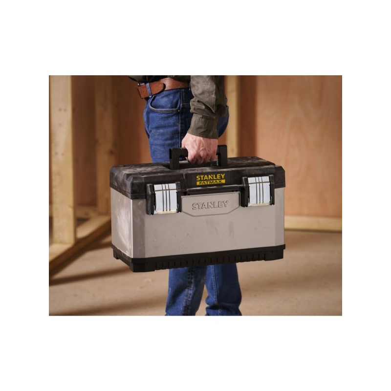Ossature métallique et polypropylène. Larges attaches métalliques. Plateau porte-outils 3/4 intégré. Rainure en V sur le couvercle pour découpe d'appoint. Cadenassable. Livrée sans outils.
