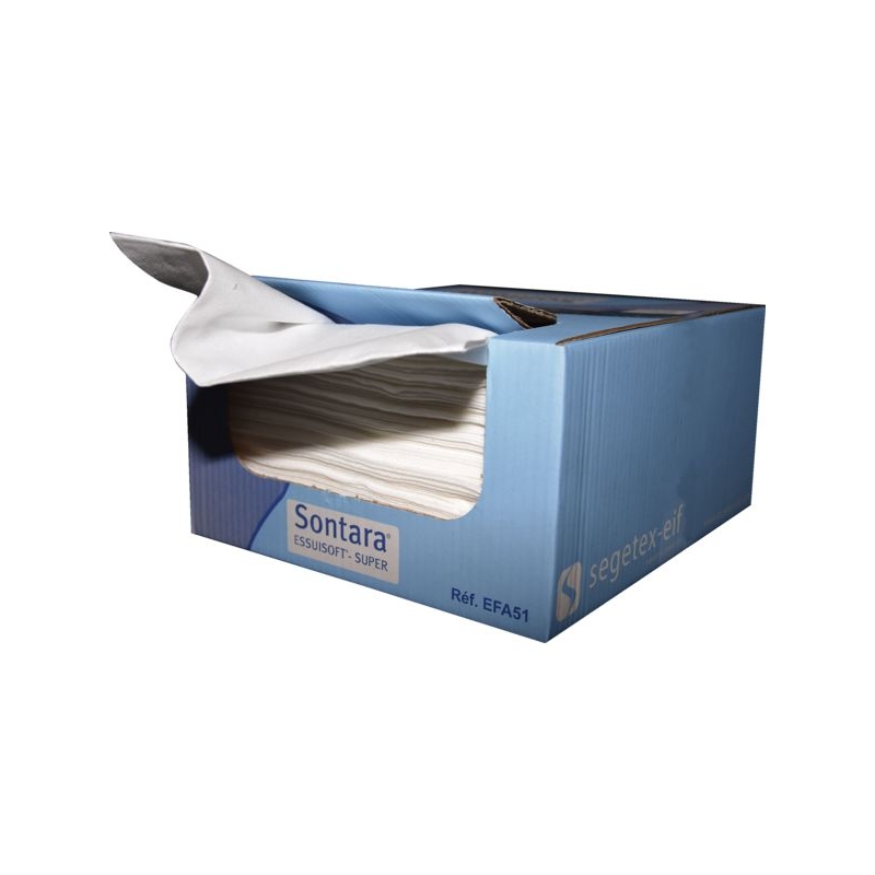Essuyage non tissé en Sontara®. En polyester et cellulose, texture non crêpée sans liant chimique ni additif. Essuyage multi-usage avec une excellente résistance mécanique et une haute capacité d’absorption. Résistant aux solvants. Coloris : blanc Dimensions : 28 x 64 cm Conditionnement : 5 boites distributrices de 120 formats