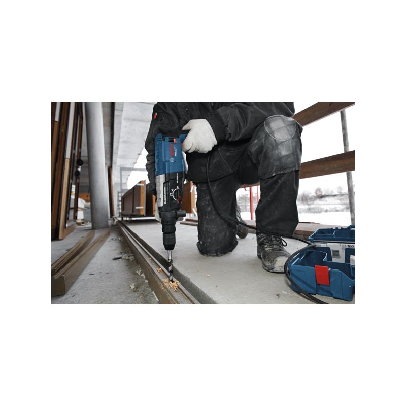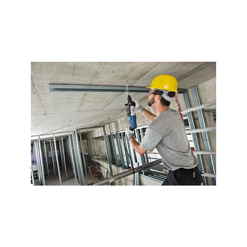 Orientation de l'outil, embrayage de sécurité, stop de rotation, stop de frappe et mandrin interchangeable. Emmanchement : SDS-Plus Puissance : 880 W Puissance de frappe : 3,2 J Vitesse : 900 tr/mn Cadence de frappe : 4000 cps/mn Taux de vibrations : 11 m/s² Poids : 3,100 kg Livré en coffret L-Case avec poignée supplémentaire, mandrin Quick-Change, mandrin interchangeable SDS-Plus, jauge de profondeur.