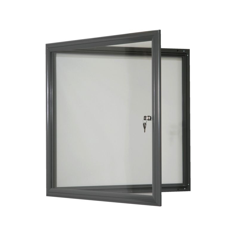 Vitrine réversible avec fond tôle laquée électrozinguée (affichage magnétique). Porte battante démontable avec charnière inox. Encadrement aluminium anodisé, façade verre Sécurit 4 mm. Fermeture par serrure dans le vitrage. Fixation murale 4 points. Épaisseur hors-tout : 35 mm Épaisseur utile : 21 mm Existe en noir, gris et rouge.