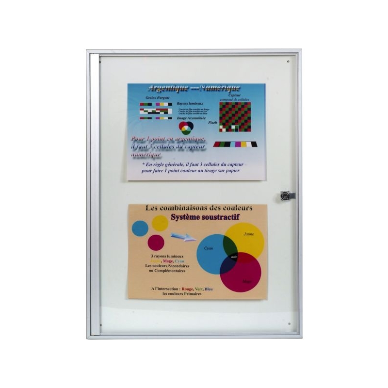 Porte battante, fermeture par serrure à clé avec pose à droite. Profil alu anodisé naturel, façade plexiglas avec entourage à partir du format 6 feuilles. Fond tôle blanc pour affichage magnétique. Fixation murale 4 points. Absence d'entourage de porte pour le format 4 feuilles. Épaisseur hors-tout : 20 mm Épaisseur utile : 12 mm